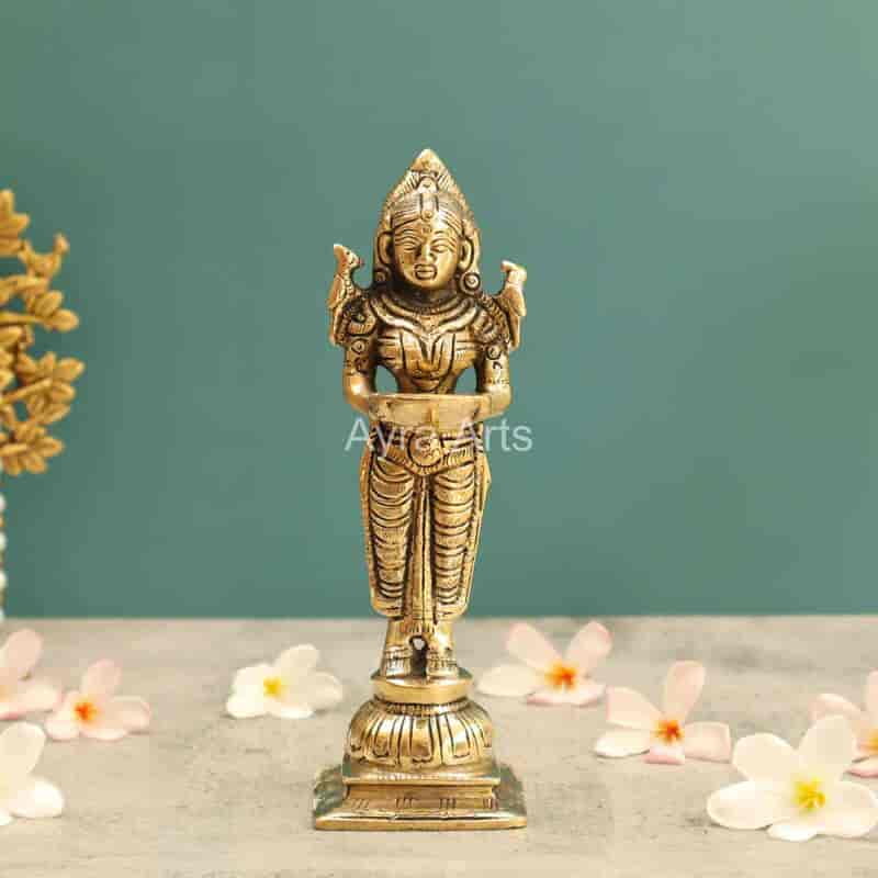 Light up your festivities with this 7.5-inch Brass Deep Lakshmi statue holding an oil diya — perfect for Diwali and daily worship.