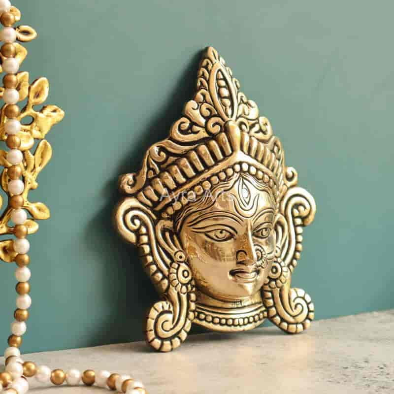 Elevate your home with this 7-inch Brass Goddess Durga Mata Face Wall Hanging Mount — powerful and elegant.