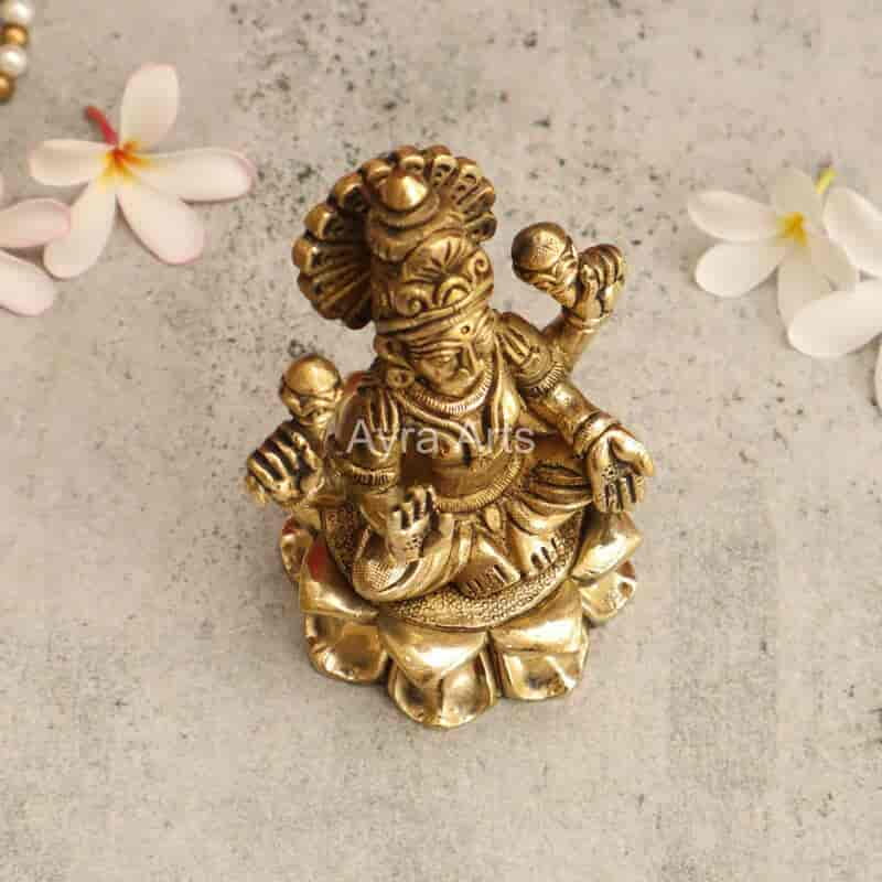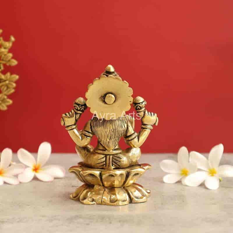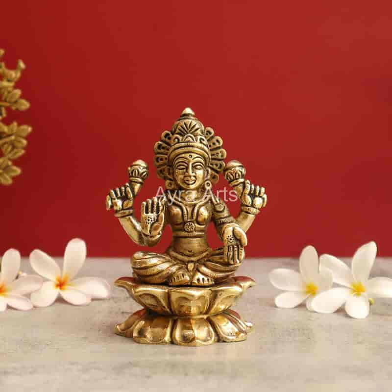 Invite prosperity with this elegant 5-inch Brass Lakshmi Statue seated gracefully on a lotus.