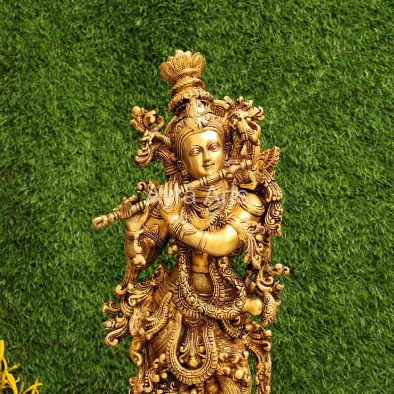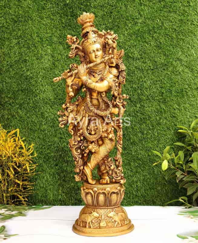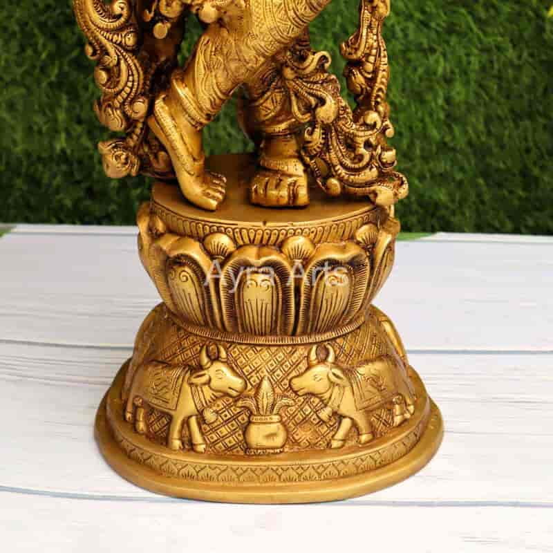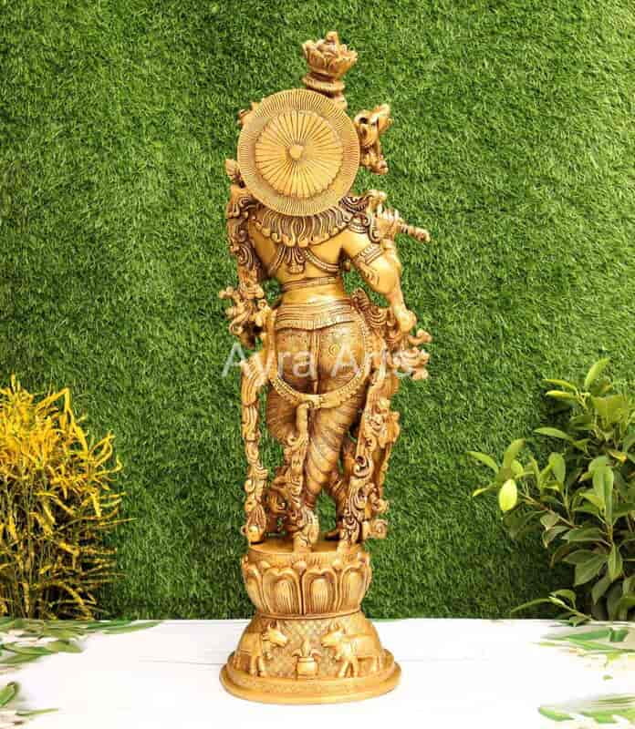 Elevate your decor with this 30-inch Brass Krishna Idol with cows on the base, finished in golden antique polish — a royal addition.