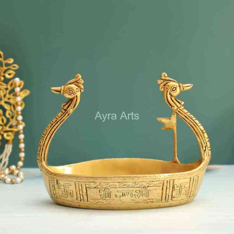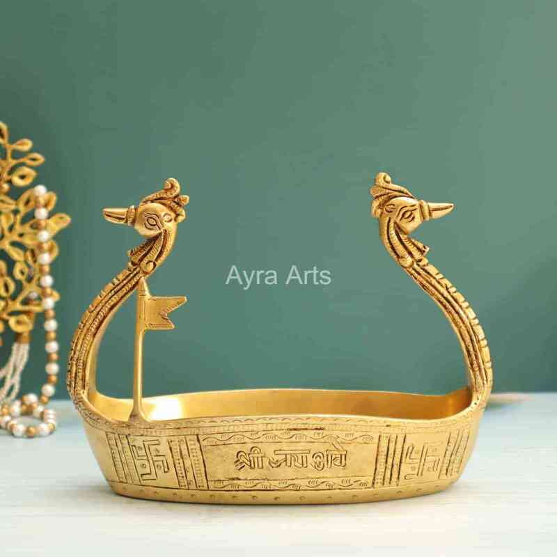 Decorate your space with this 6.5-inch Brass Krishna Nauka Vihar Swan Boat Showpiece — elegant and divine.
