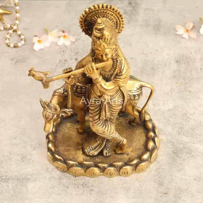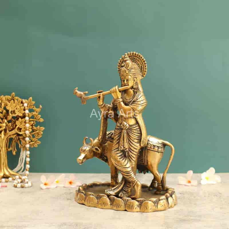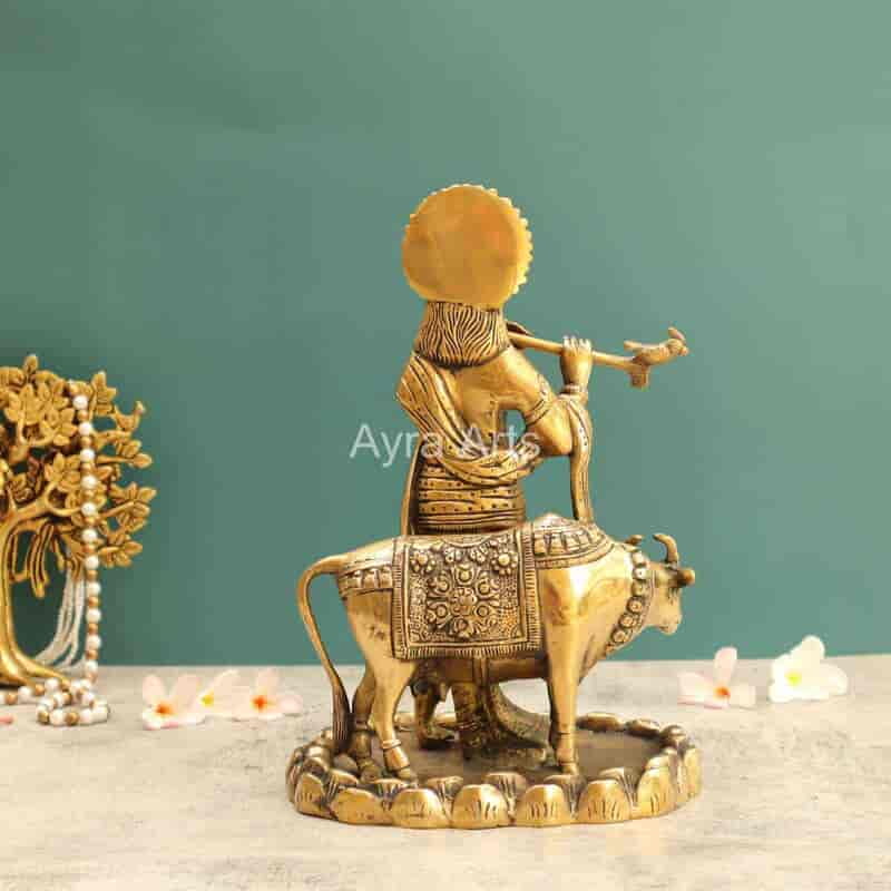 Majestic 11-inch Brass Krishna playing flute with Cow (Gau Mata) idol — perfect for worship.