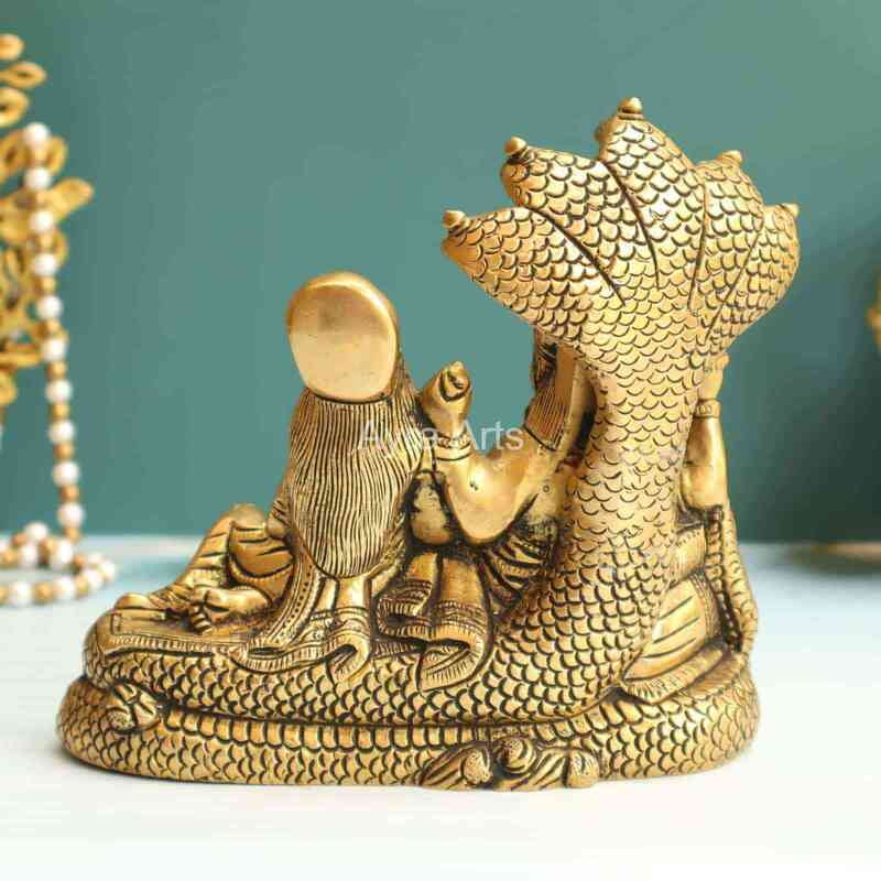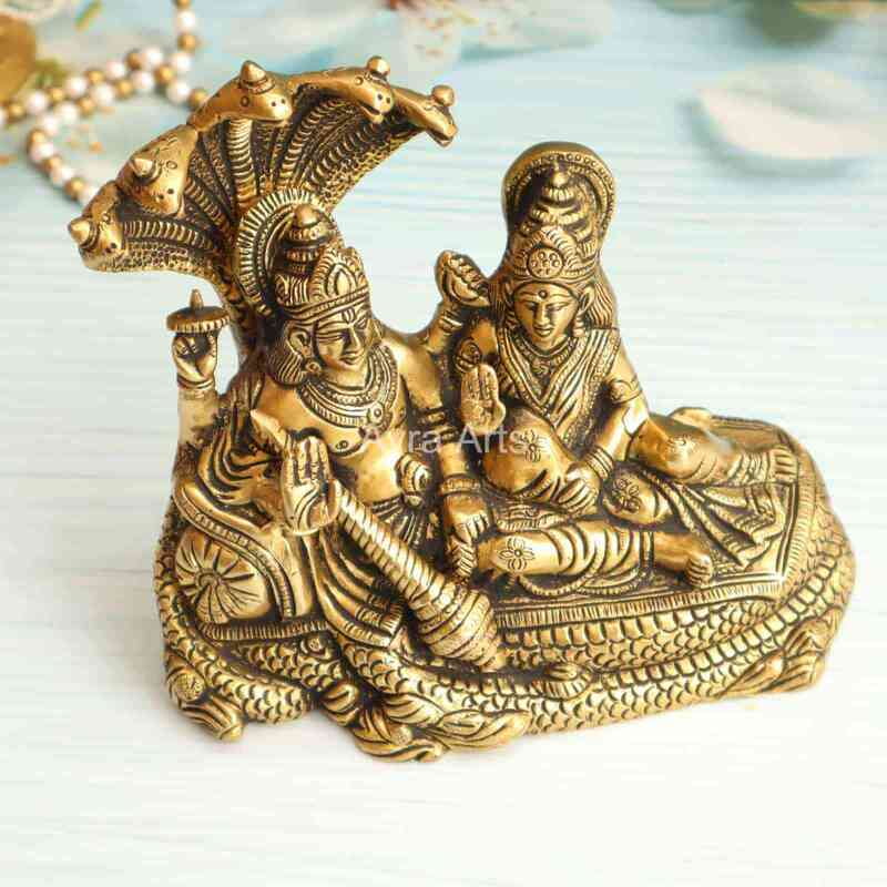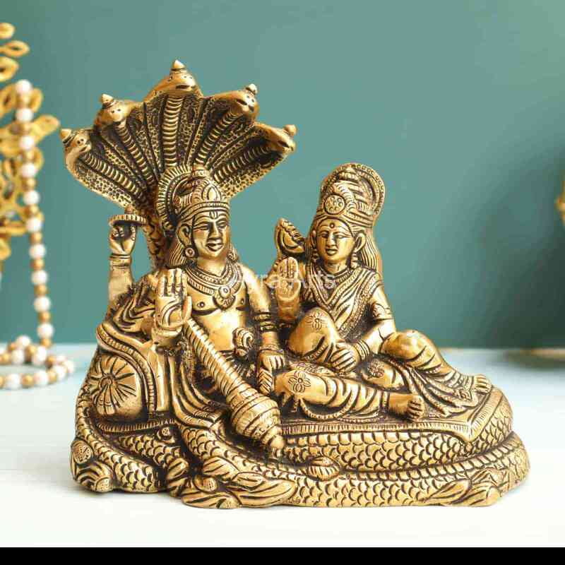 Enhance your altar with this 8-inch Brass Lakshmi Sametha Narayana Vishnu Murthi Relaxing on Sheshnag — divine and elegant.