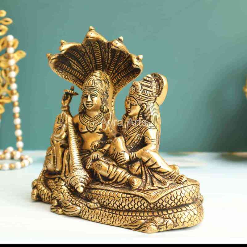 Ayra Arts presents the serene Brass Lakshmi Sametha Narayana Vishnu Murthi Relaxing On Sheshnag, spanning a length of 8 inches. Meticulously crafted, this exquisite sculpture depicts the divine union of Goddess Lakshmi and Lord Vishnu in a state of relaxation atop Sheshnag, the divine serpent. Made from premium brass, this masterpiece exudes timeless elegance and spiritual significance, symbolizing abundance, harmony, and divine grace. Whether displayed as a centerpiece in your home temple or as a decorative accent, this creation from Ayra Arts invites blessings and fosters an atmosphere of tranquility, prosperity, and spiritual fulfillment.