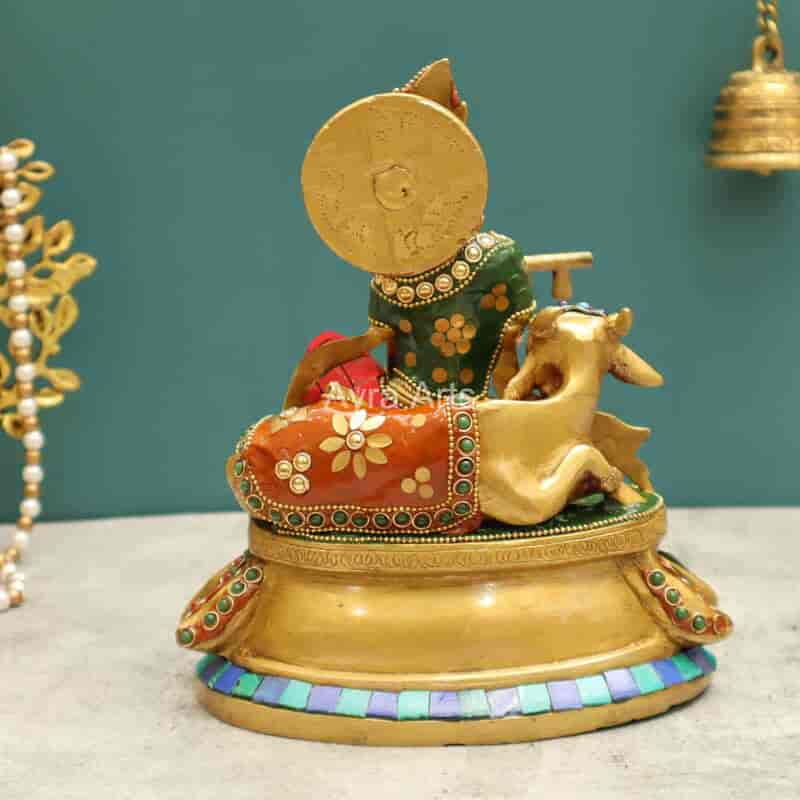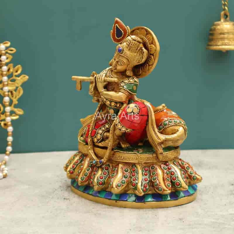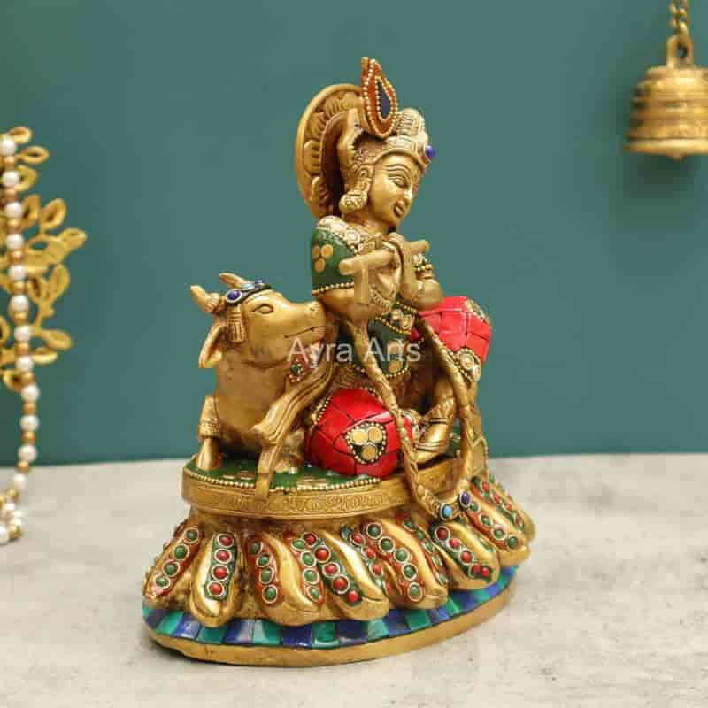 Celebrate divinity with this 8.5-inch Brass Lord Shri Krishna Idol Sitting with Cow and Playing Flute in Stone Work — exquisite craftsmanship.