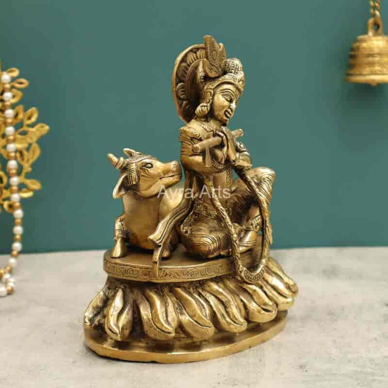 Brass Lord Shri Krishna Idol Sitting with Cow and Playing Flute Kishan Bhagwan Murti - 8.5 Inch Height