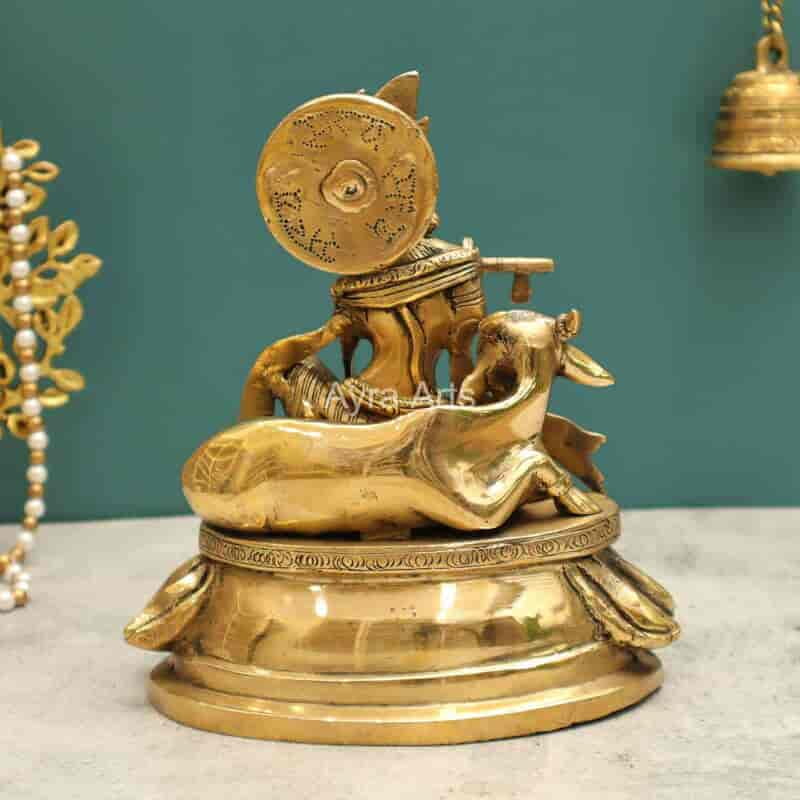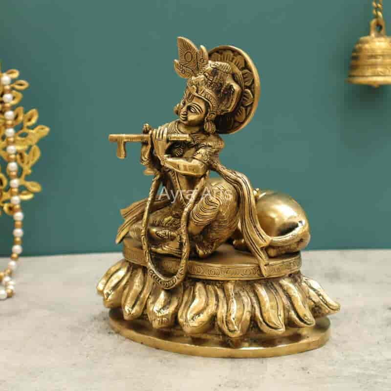 Bring blessings with this 8.5-inch Brass Lord Shri Krishna Idol Sitting with Cow and Playing Flute — timeless beauty.