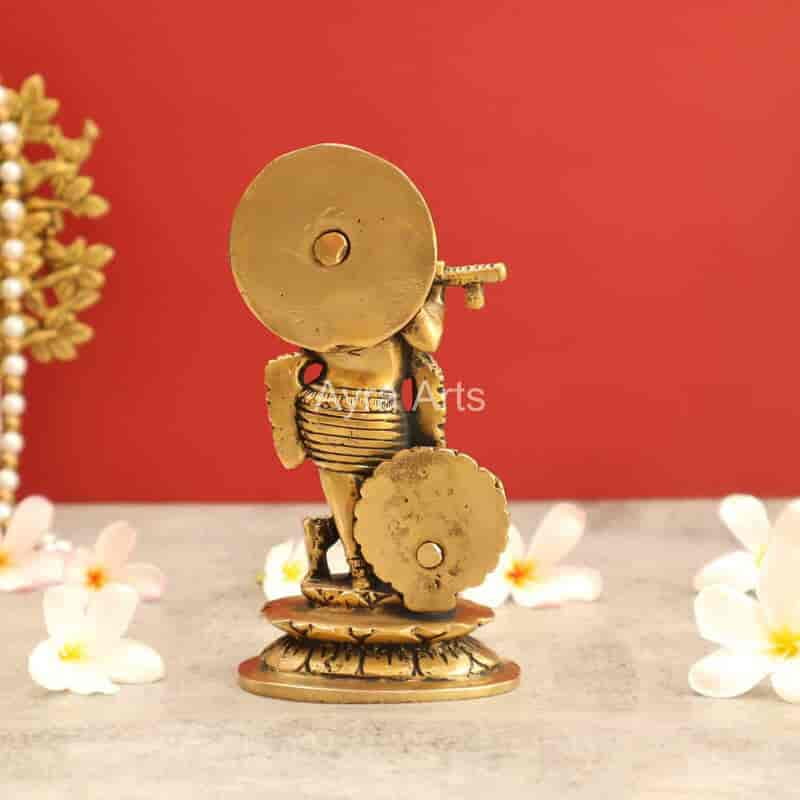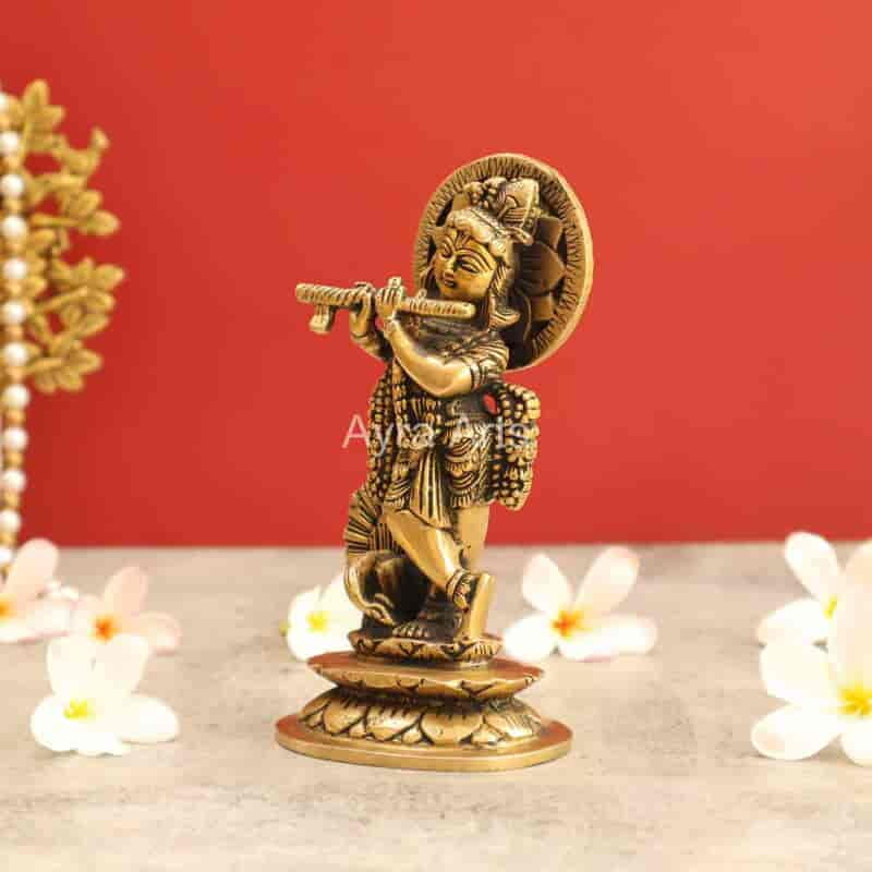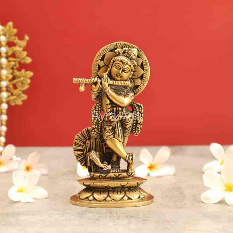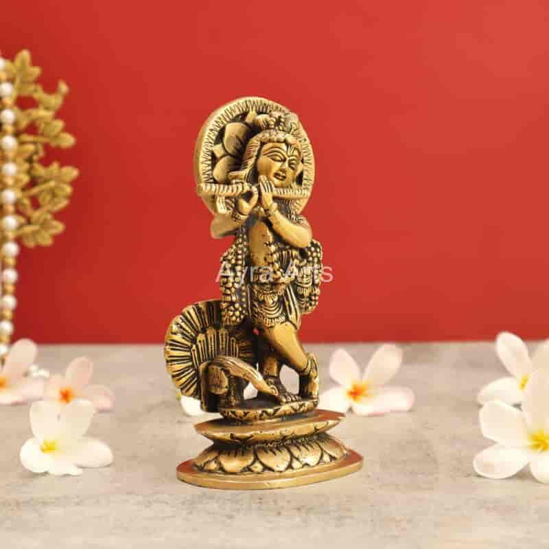 Enhance your decor with this 5.8-inch Brass Murali Krishna Murti statue, beautifully paired with a peacock motif.