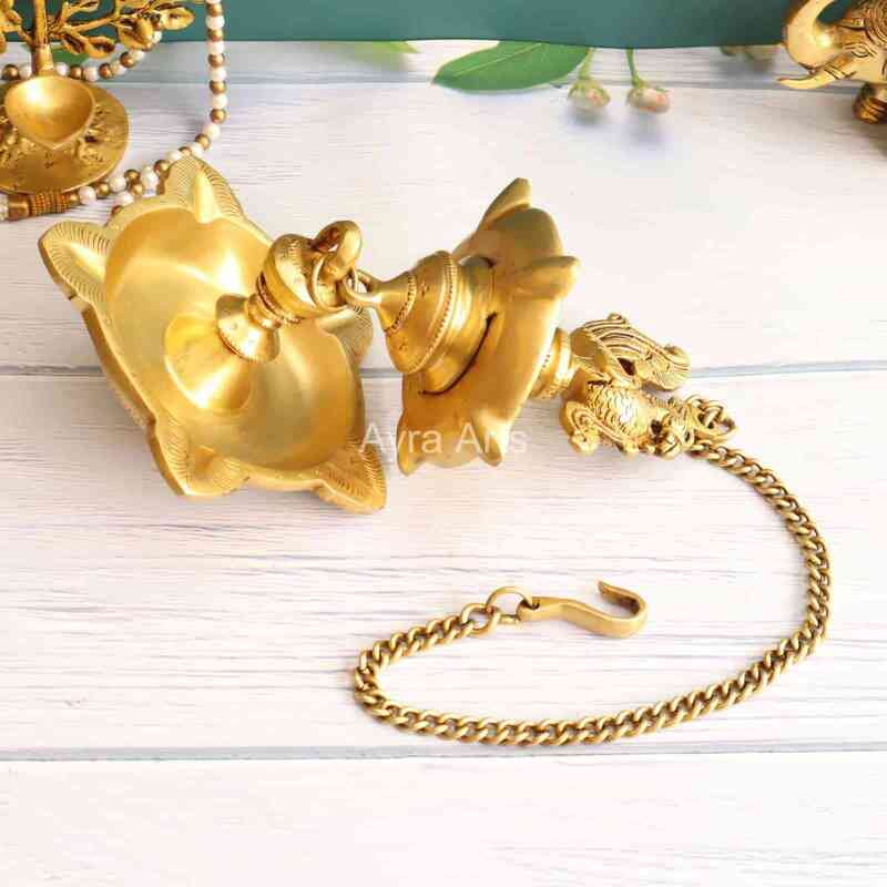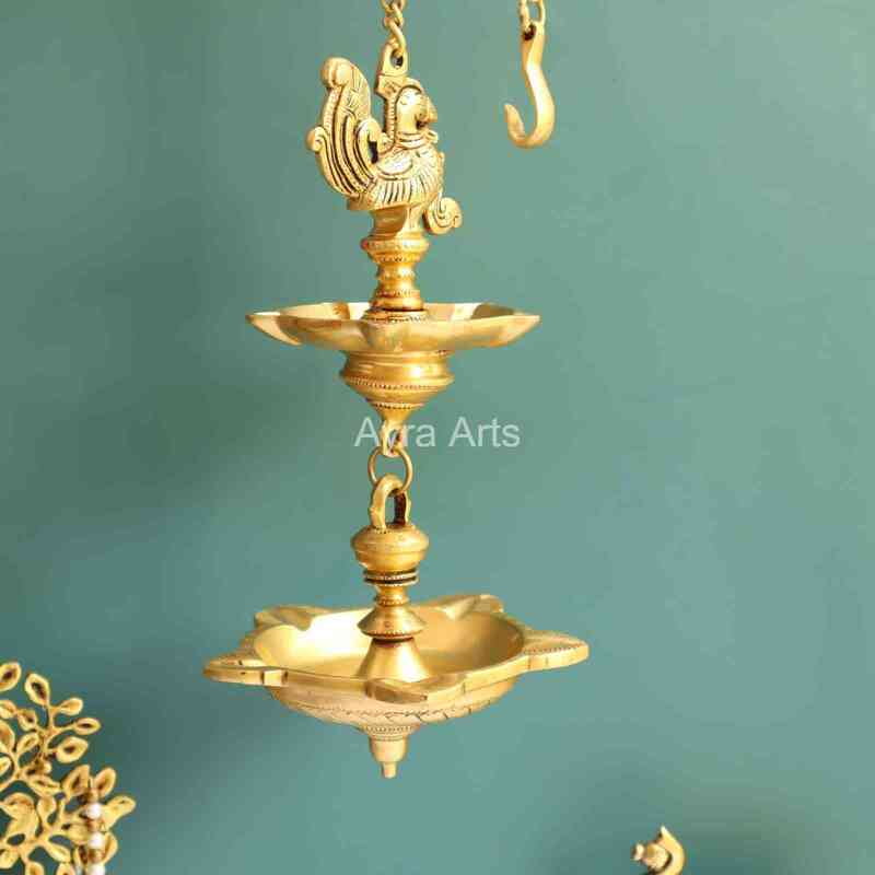 Illuminate your space with the majestic elegance of Ayra Arts Brass Peacock Diya Oil Lamp Wall Hanging, featuring a ten-wick petal design, standing tall at 30 inches in height. Meticulously crafted, this exquisite lamp embodies the regal beauty of the peacock, symbolizing grace, prosperity, and divine blessings. Made from premium brass, this lamp exudes timeless charm and spiritual significance, inviting warmth and radiance into your home. Whether hung on a wall or displayed as a centerpiece, this creation from Ayra Arts adds a touch of opulence and sacredness to any environment, fostering an atmosphere of reverence and spiritual connection.