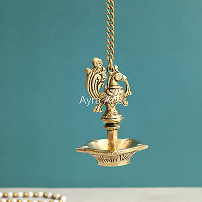 3-inch brass peacock five wick petal hanging diya — bright and traditional for temple use.