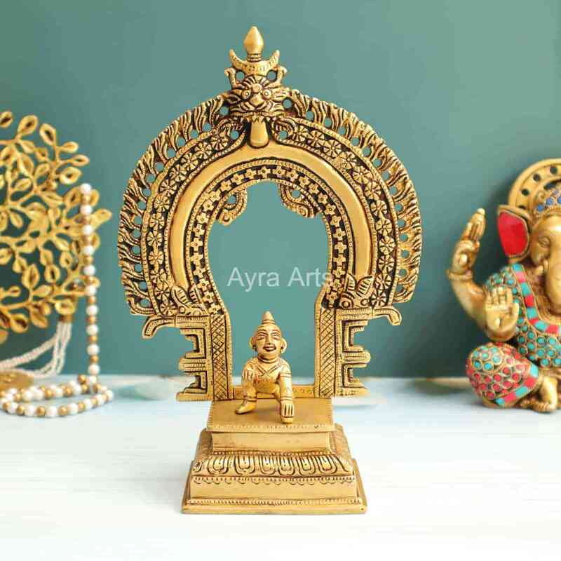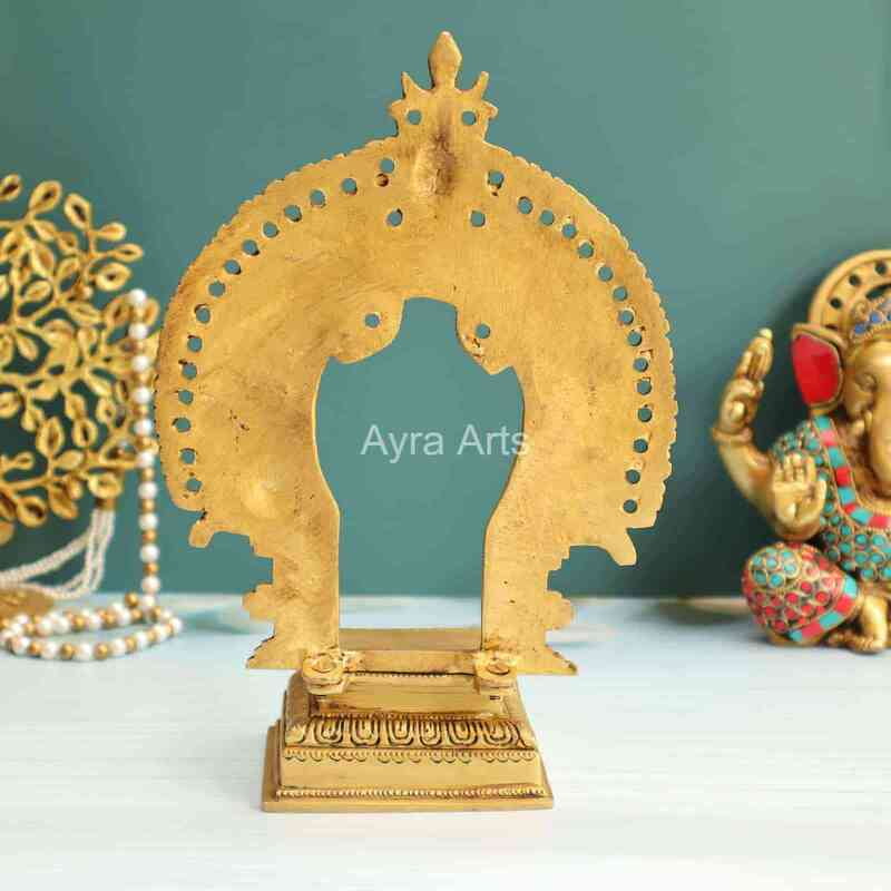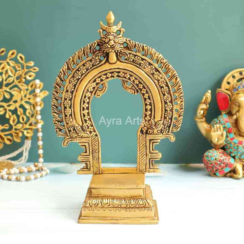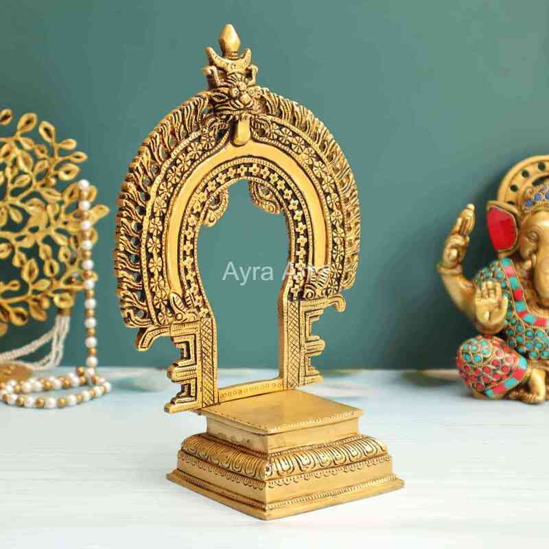 Introducing Ayra Arts Brass Prabhavali Thiruvachi Mandap Makarathoranam with Stand, standing gracefully at 10 inches in height. Meticulously crafted, this exquisite piece captures the intricate beauty of a traditional Hindu temple arch with Makarathoranam, symbolizing auspiciousness and divine blessings. Made from premium brass, this prabhavali exudes timeless elegance and spiritual significance, adding a touch of grandeur to your home temple or sacred space. Whether used as a decorative accent or as part of your religious ceremonies, this creation from Ayra Arts invites divine presence and fosters an atmosphere of reverence, spirituality, and aesthetic delight.