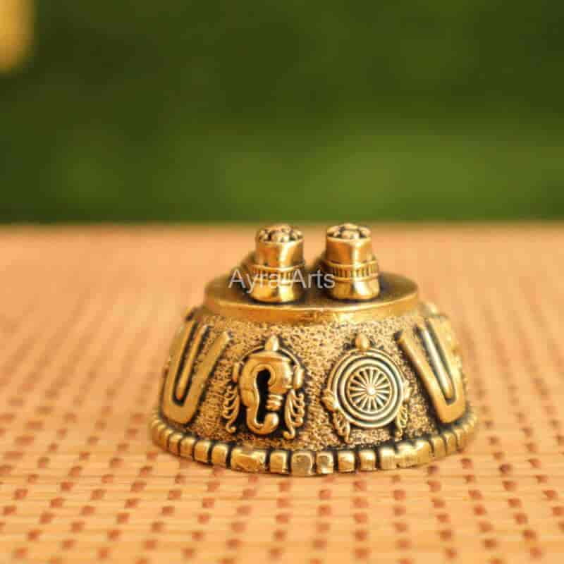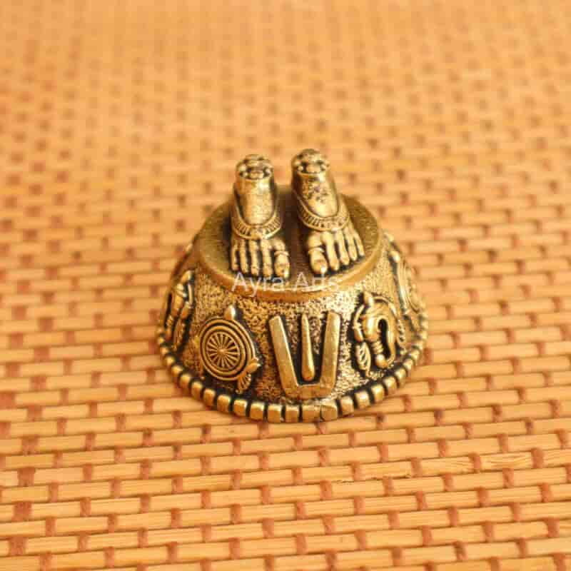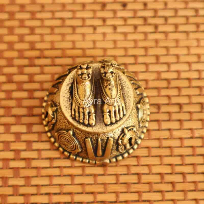 Keep sacred feet close with this 1-inch Premium Brass Tirupati Balaji Charan Paduka with Shanku & Chakra Namam — a divine touch.