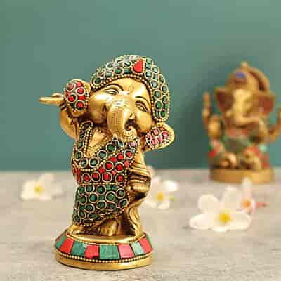 Brass Vignesha Unique Ganesha Statue with Stonework for Home Decor and Gift - 5.2 Inch Height