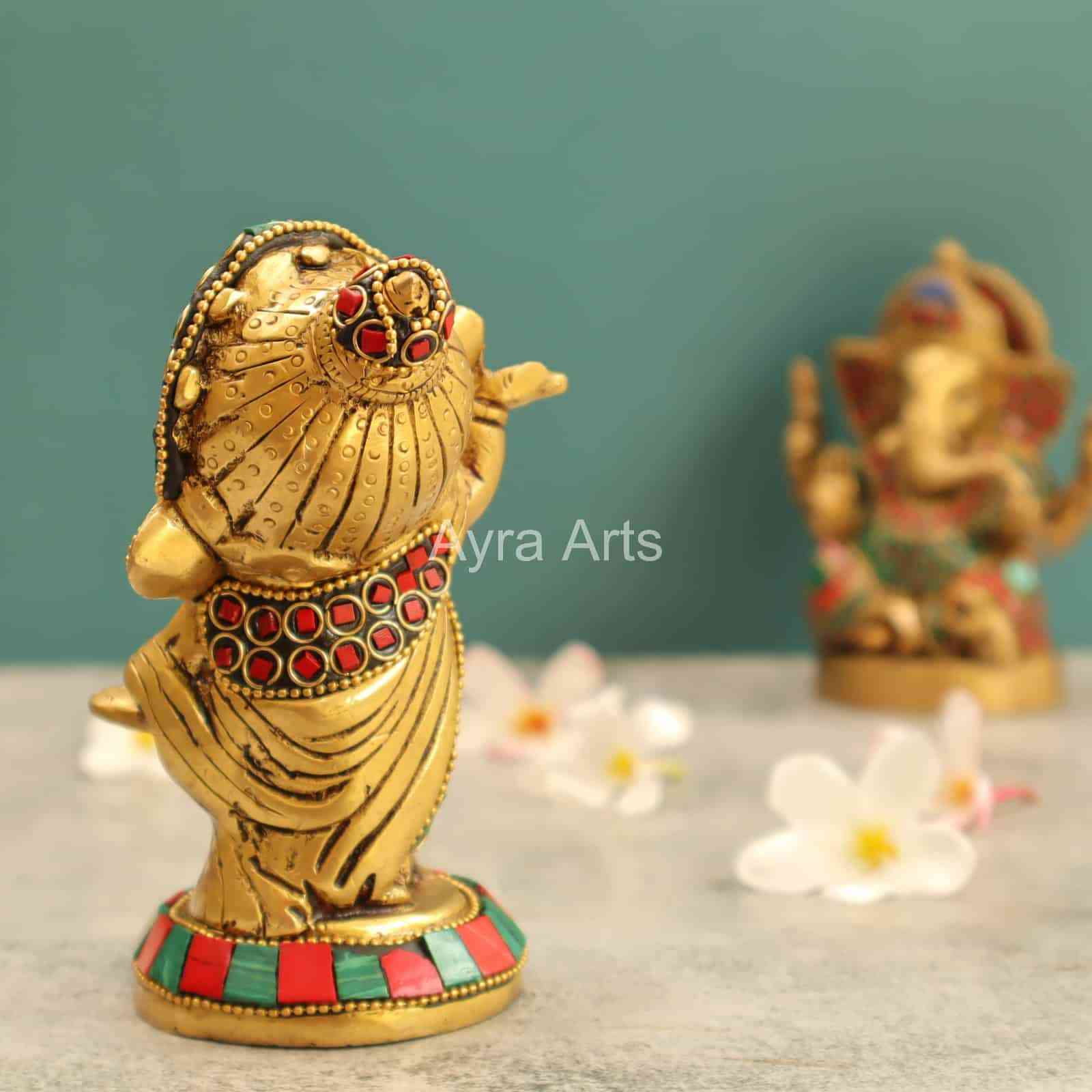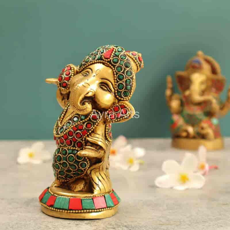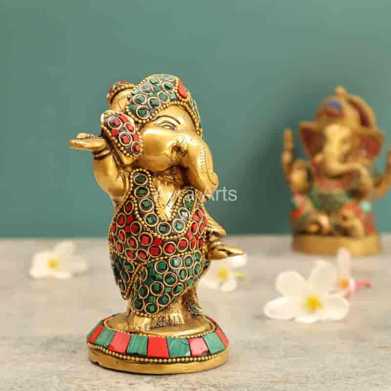 Add uniqueness to your altar with this 5.2-inch Brass Vignesha Ganesha statue with detailed stonework.