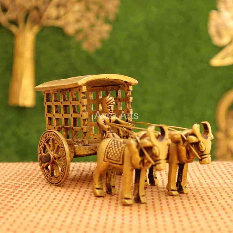 Introducing Ayra Arts Brass Village Double Bullock Cart Showpiece, standing elegantly at 3 inches in height. Meticulously crafted, this exquisite showpiece captures the rustic charm of a traditional Indian bullock cart, featuring intricate detailing and craftsmanship. Made from premium brass, this showpiece exudes timeless elegance and cultural significance, symbolizing rural life and traditional craftsmanship. Whether displayed as a decorative accent, on a shelf, or as part of a themed collection, this creation from Ayra Arts adds a touch of rustic beauty and nostalgia to your space, fostering an atmosphere of tradition, heritage, and artistic appreciation.