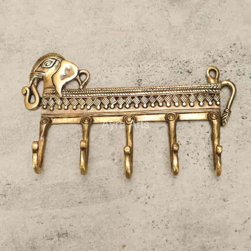 Dhokra Art Elephant Design Brass Wall Keychain Or Clothes Hanger - 8 Inch Length