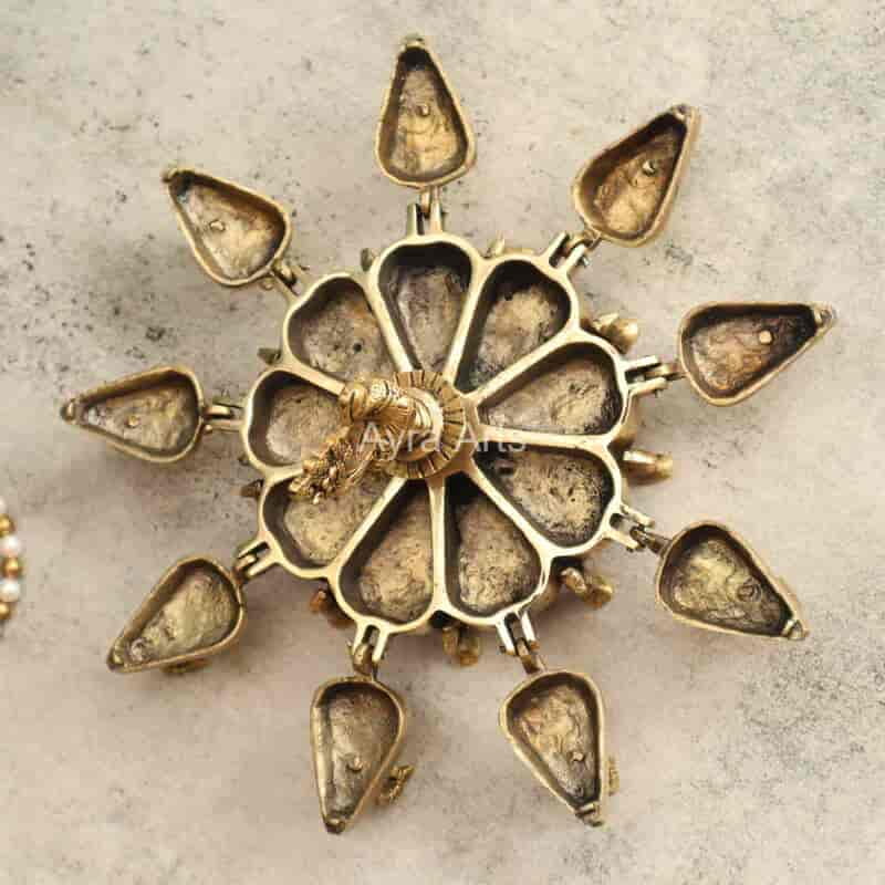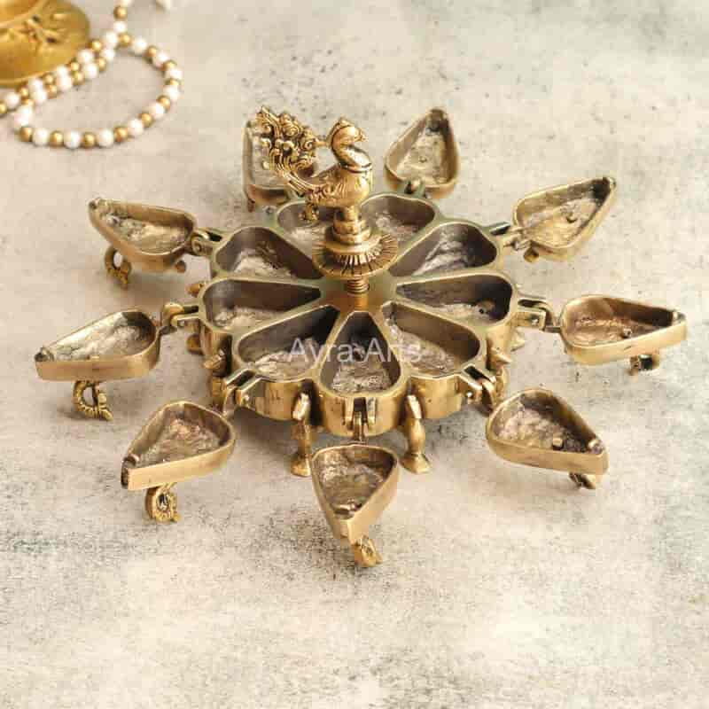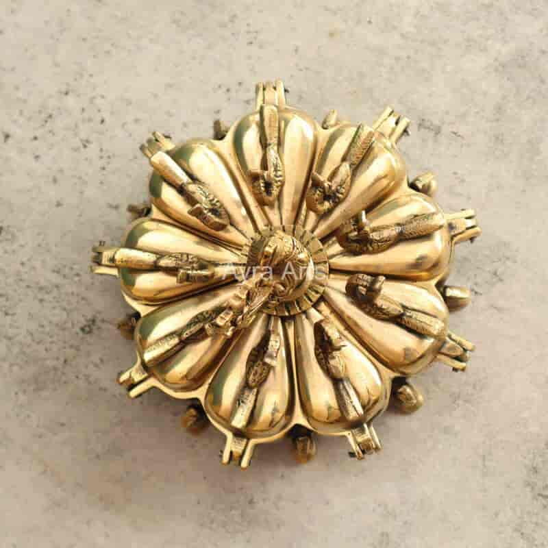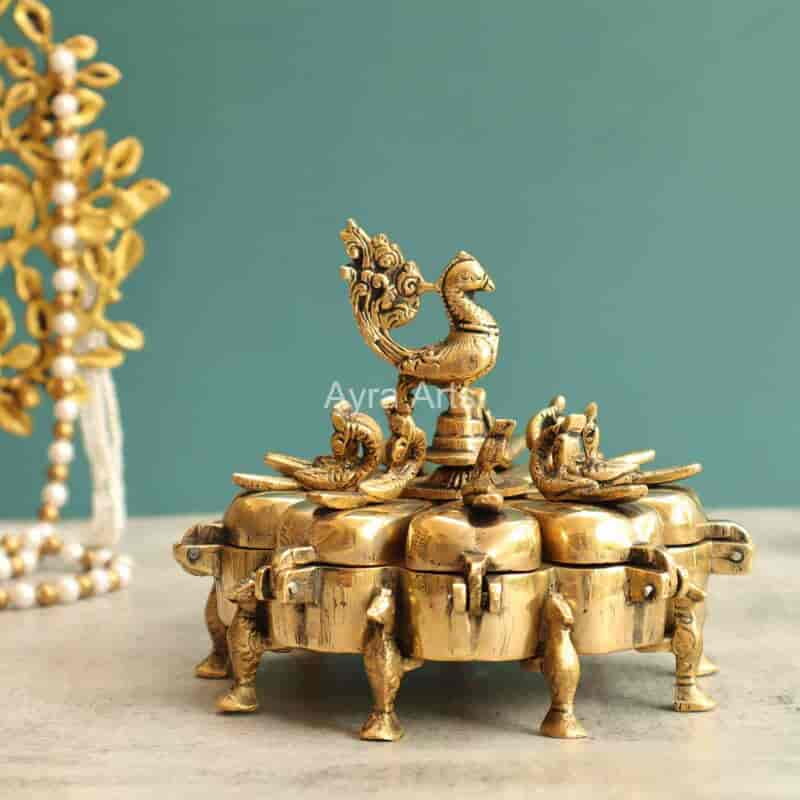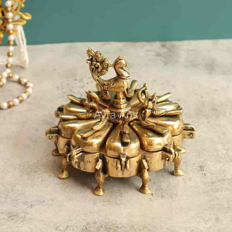 Adorn your pooja with this 5-inch Extremely Beautiful Brass Sindoor Kumkum Box with 9 Compartments and Peacock Design — practical and ornate.