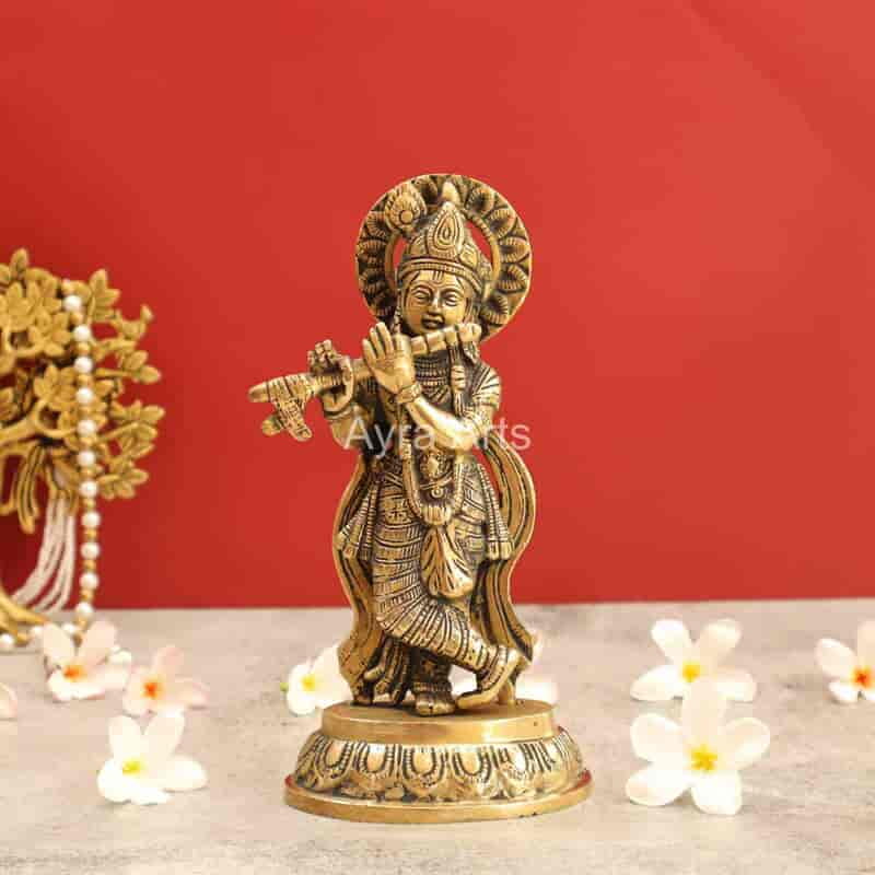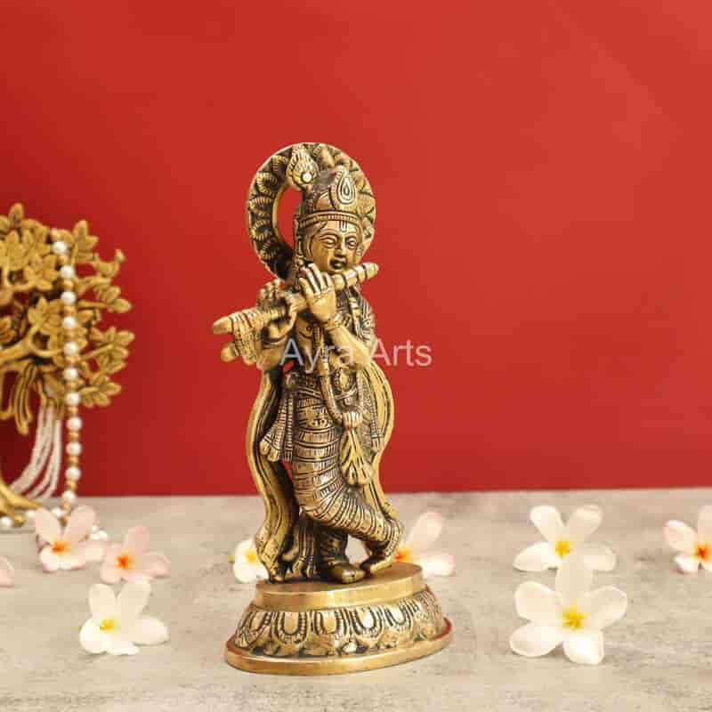 Beautiful 8.5-inch Flute Playing Krishna Murti brass statue — symbolizing devotion and joy.