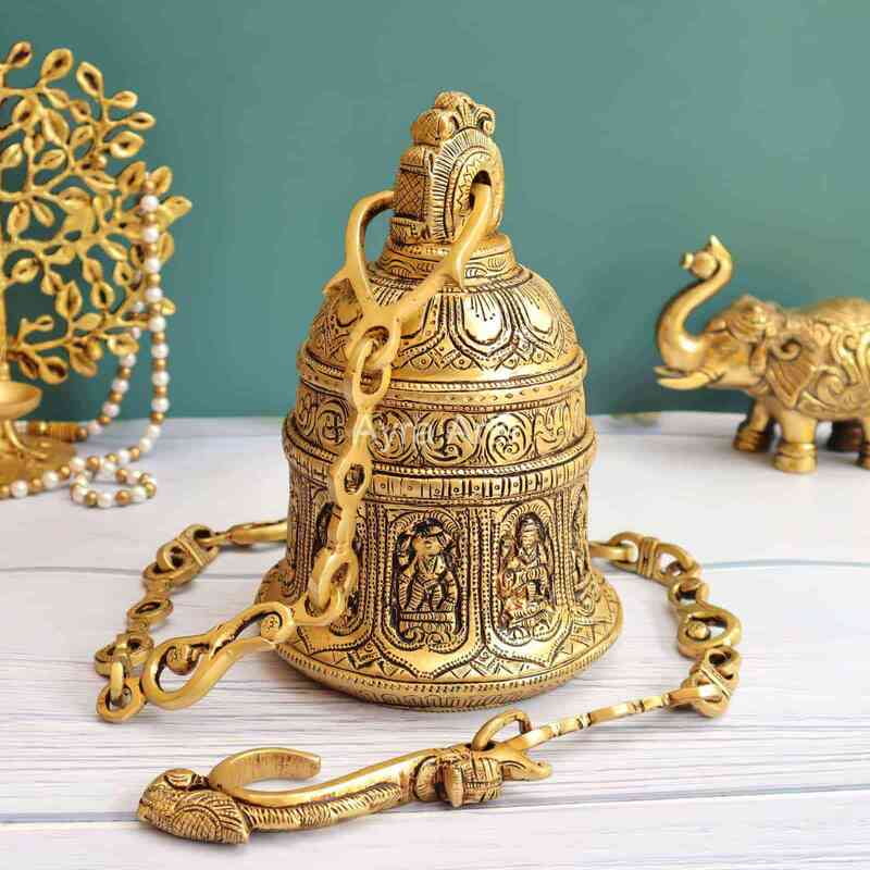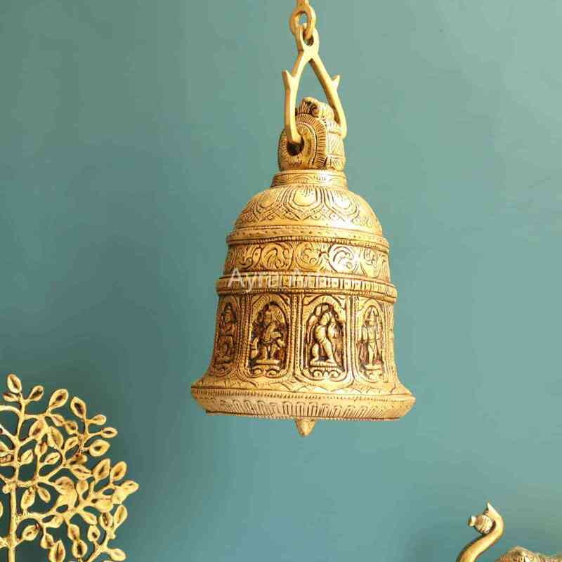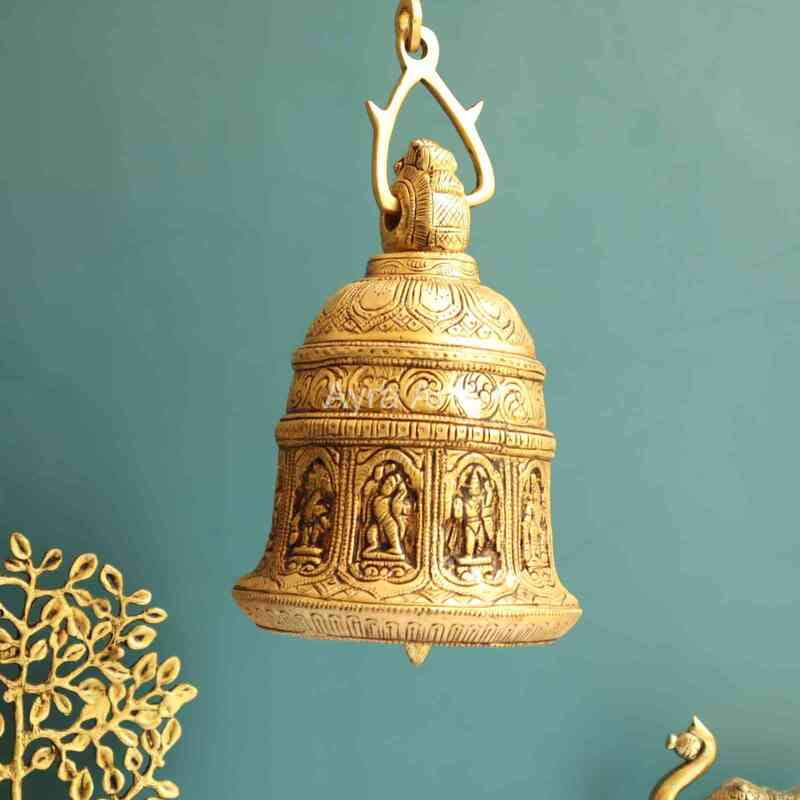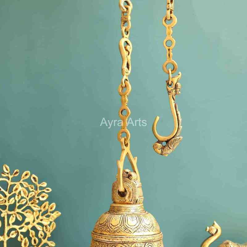 Enhance your spiritual ambiance with Ayra Arts God Lord Vishnu Dashavataram Engraved Hanging Temple Wall Ghanta Bell with Chain, standing at an impressive 43 inches in height. Meticulously crafted, this exquisite bell features intricate engravings of Lord Vishnu's ten divine avatars, symbolizing protection, prosperity, and cosmic balance. Made from premium brass, this hanging bell radiates timeless elegance and spiritual significance, making it a perfect addition to your temple, home entrance, or sacred space. Whether used for worship or as a decorative accent, this creation from Ayra Arts invites divine blessings and reverence into your home, fostering an atmosphere of serenity, devotion, and spiritual connection.