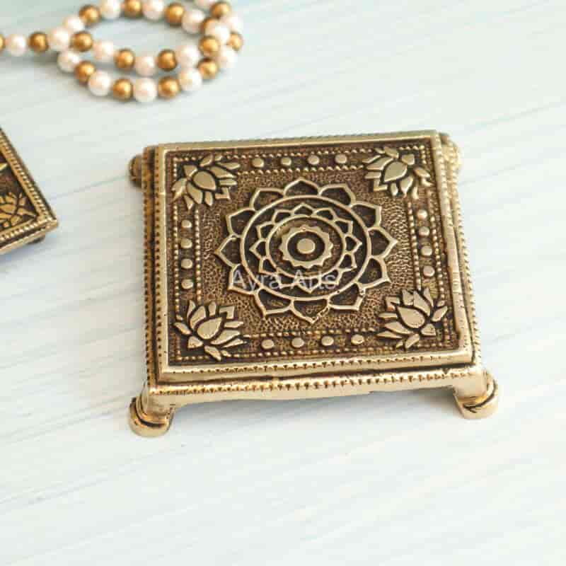Make your pooja space special with this handcrafted 4-inch Brass Square Shaped Puja Chowki — ideal for mandir setups.