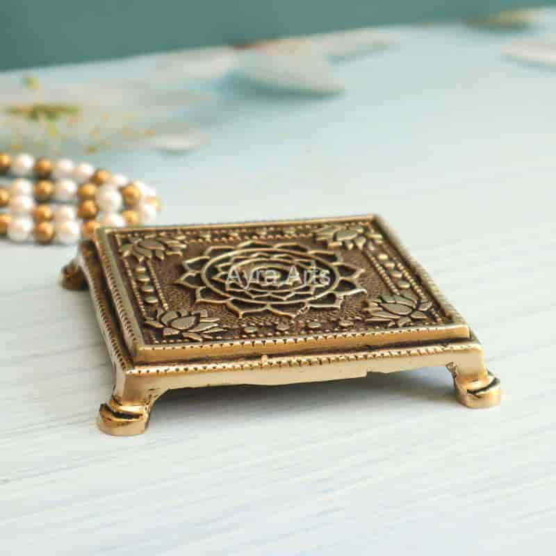 Handcrafted Brass Square Shaped Puja Chowki for Home Pooja Mandir Choki - 4 Inch Length