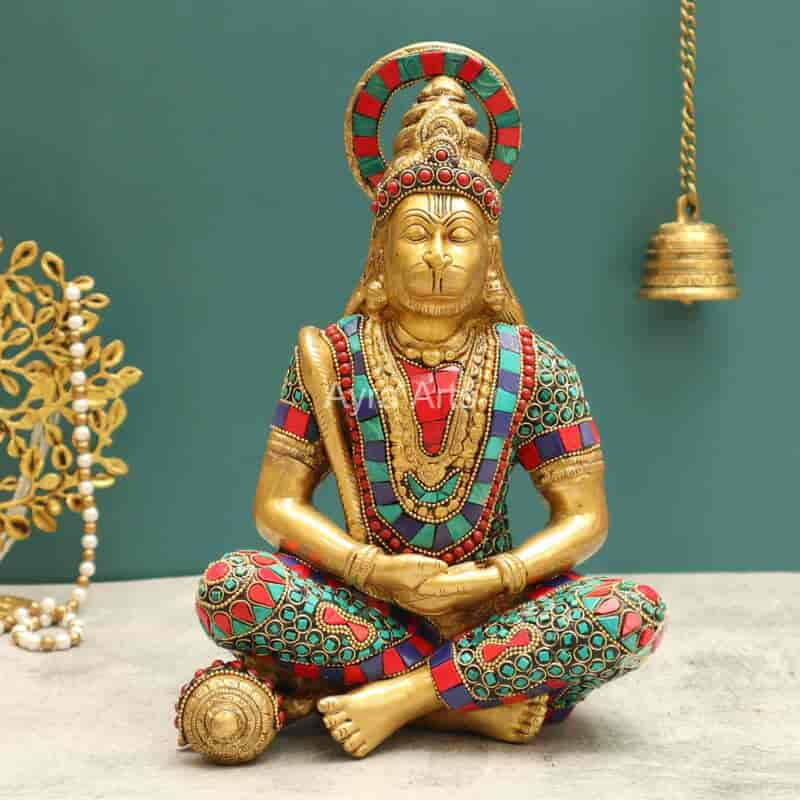 Maharudra Tapas Hanuman In Meditation Dhyanam Brass Idol with Stone Work - 11 Inch Height