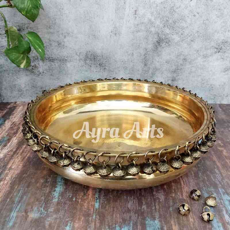 Enhance your home with the Ornate Brass Urli with Bells from Ayra Arts, 12 inches in length. This beautiful bowl, decorated with bells, is perfect for floating flowers or candles, creating a peaceful and inviting atmosphere. Made from high-quality brass, it is durable and elegant. Ideal for special occasions, gifts, or everyday decor, this brass urli adds a touch of traditional charm to any space. Order now from Ayra Arts and bring a touch of beauty and serenity to your home with this lovely Ornate Brass Urli with Bells.