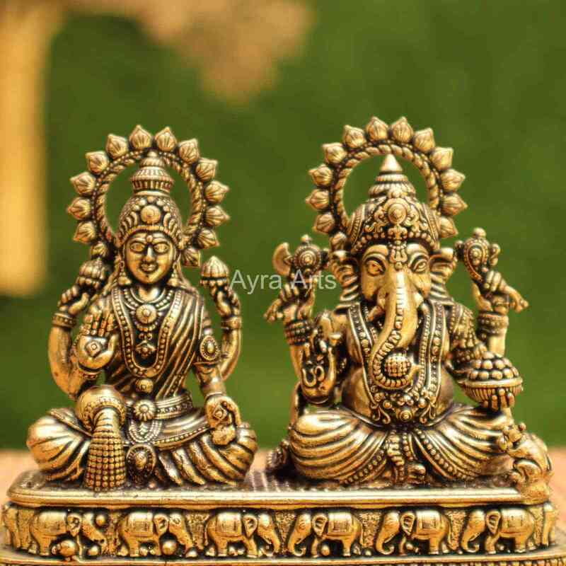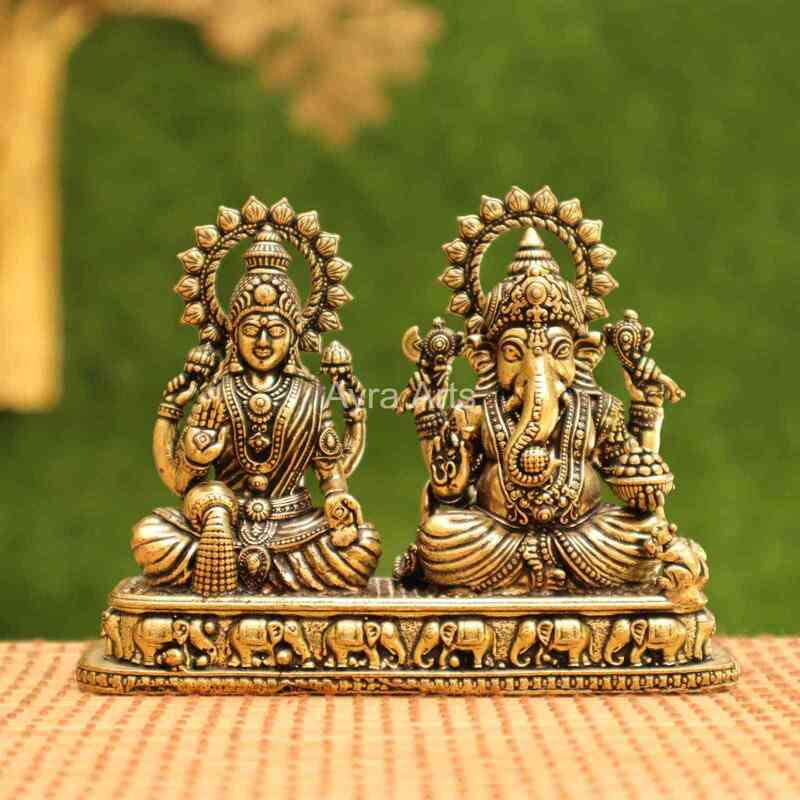 Introducing Ayra Arts Premium Brass Lakshmi Ganesh Idol, standing gracefully at 3 inches in height. Meticulously crafted, this exquisite masterpiece captures the divine presence of both Goddess Lakshmi and Lord Ganesh, symbolizing wealth, prosperity, and auspiciousness. Made from high-quality brass, this idol is not only elegant but also lightweight, making it easy to handle and display. Whether adorning your home altar, during Pooja ceremonies, or as a decorative accent, this creation from Ayra Arts invites blessings and adds a touch of sacredness and beauty to your space, fostering an atmosphere of abundance, harmony, and spiritual fulfillment.