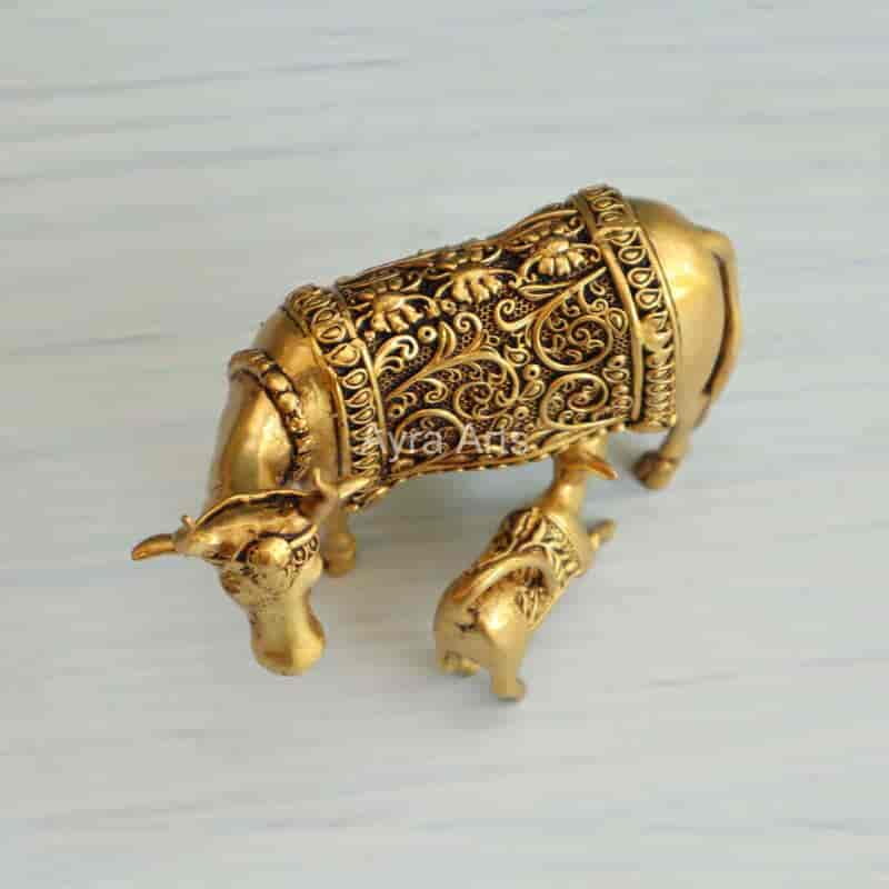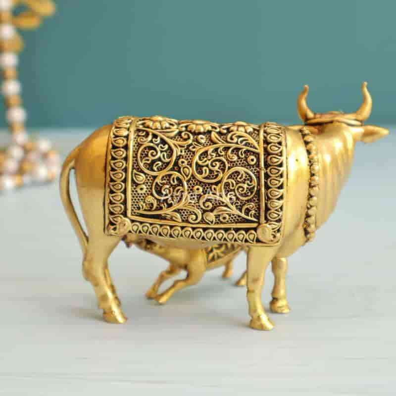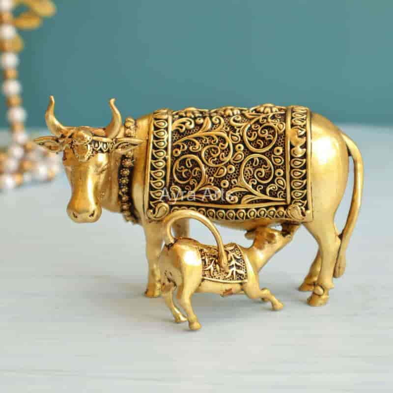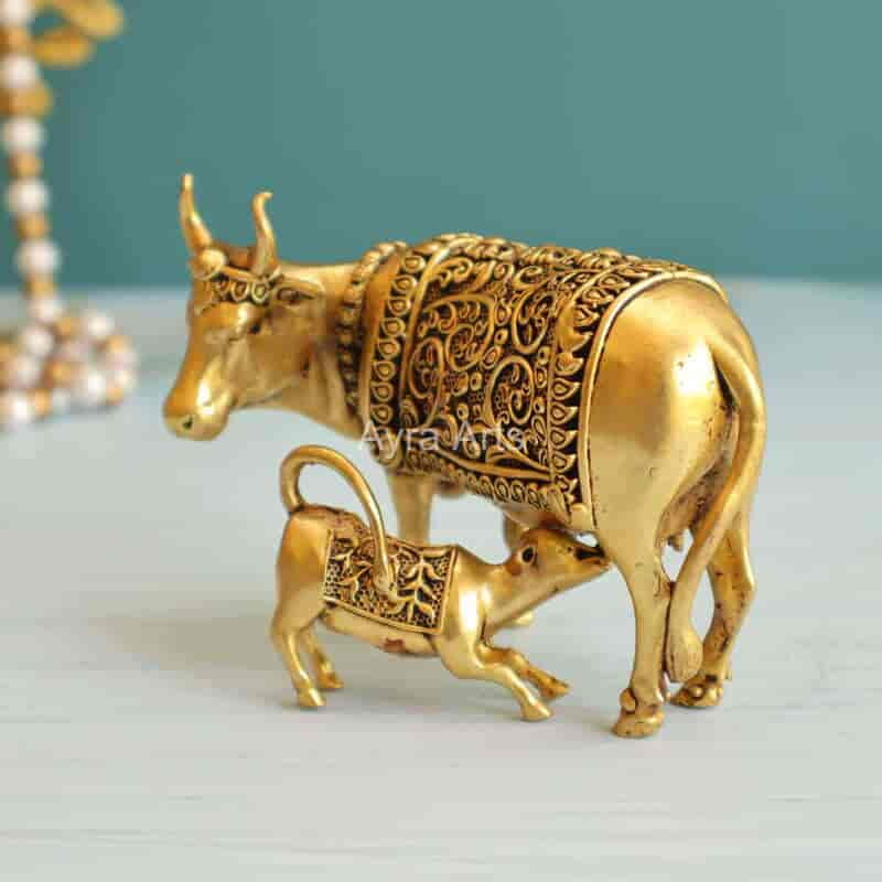 Bring pooja charm with this 2.8-inch Premium Brass Small Kamdhenu Cow with Calf Idol — auspicious and decorative.