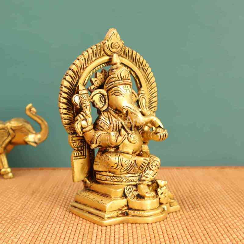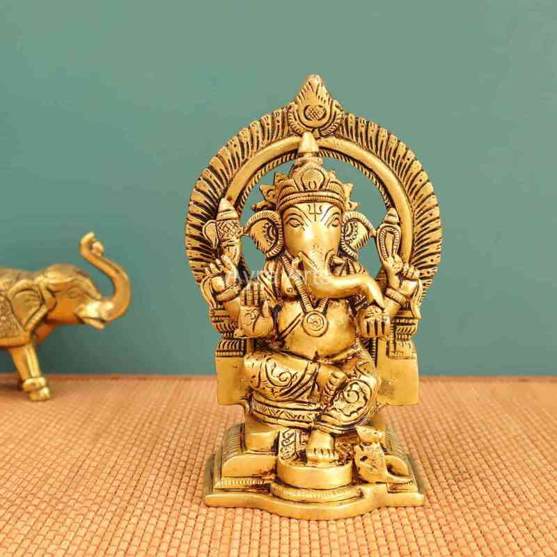 Shri Ganesh Ganapathi Seated on Throne in Brass - 6.2 Inch Height