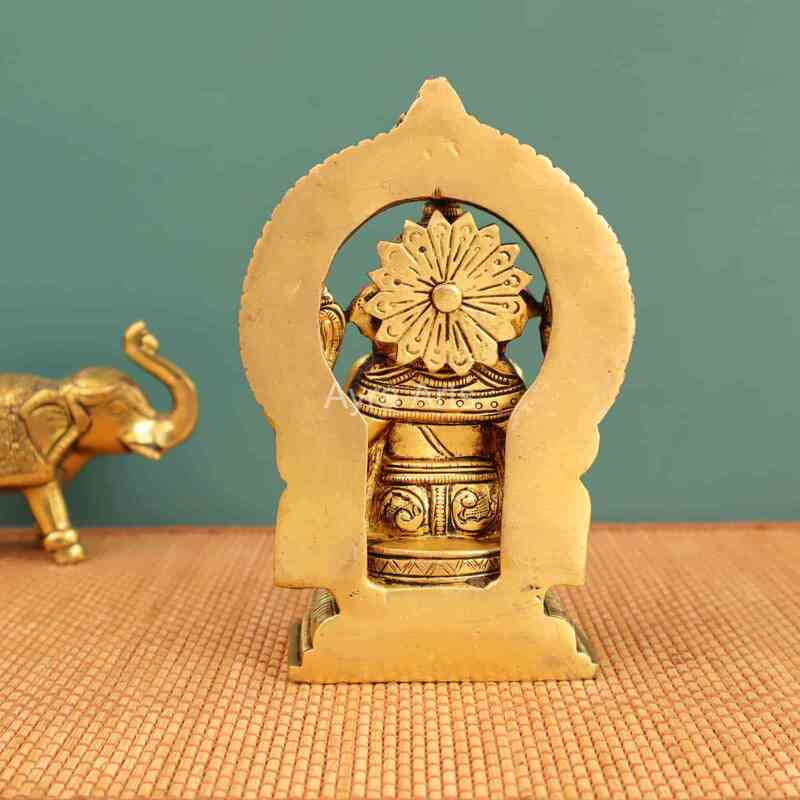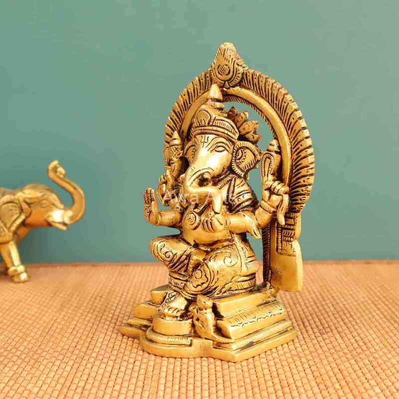 Experience divine grace with Ayra Arts Shri Ganesh Ganapathi seated on a throne in brass, standing at 6.2 inches in height. Meticulously crafted, this exquisite masterpiece captures the revered presence of Lord Ganesh, the remover of obstacles and the embodiment of wisdom and prosperity, with intricate detail and reverence. Made from premium brass, this idol exudes timeless elegance and spiritual significance, invoking feelings of devotion and auspiciousness. Whether displayed on your home altar or as a decorative accent, this creation from Ayra Arts brings the blessings of Lord Ganesh into your space, fostering an atmosphere of protection, prosperity, and spiritual fulfillment.