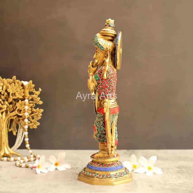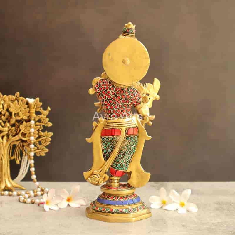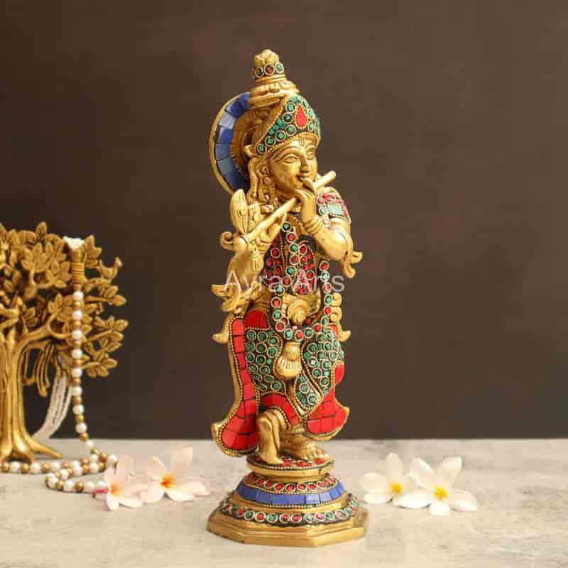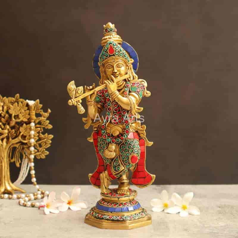 Bring vibrant spirituality with this 12-inch Super Fine Brass Krishna Idol adorned with multicolor stonework.